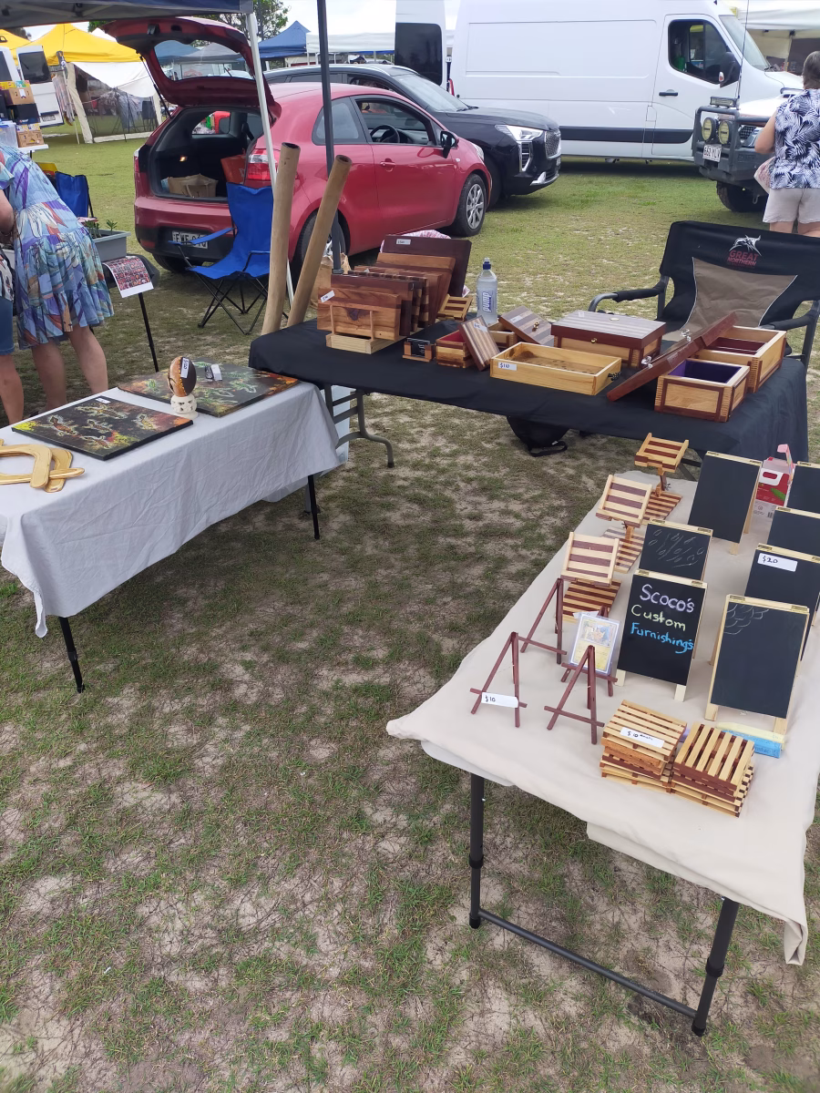 You’ll also love Aunty Juju’s artwork and handmade fashion, from earrings to statement denim jackets, and the carving and weaving of Biripi artist Joedie Lawler. Every purchase supports Aboriginal artists and keeps culture strong — come along, have a yarn, and take home something truly special.